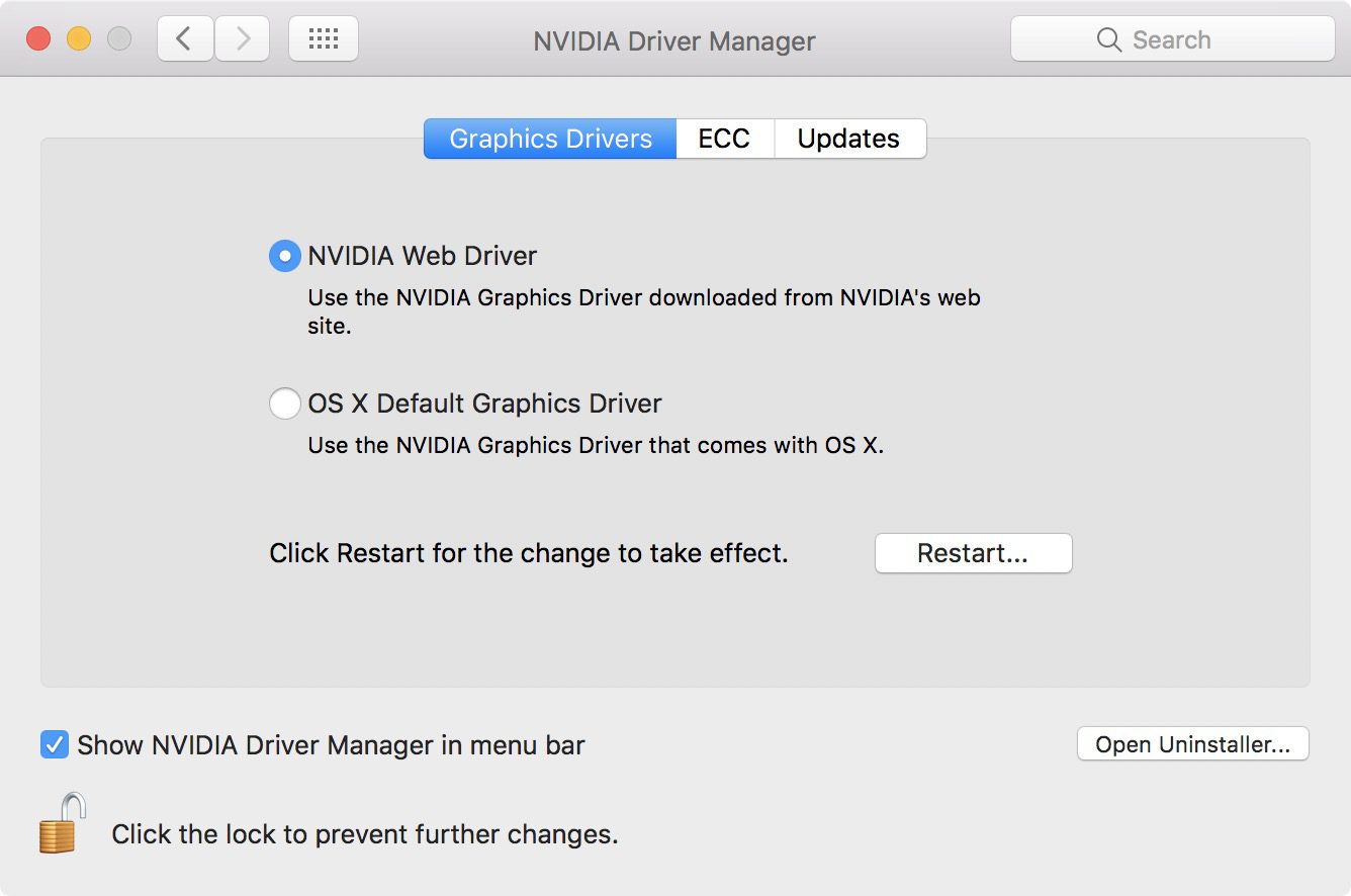 nvidia-web-drivers-pascal-system-preferences Опубликовано11/04/2017 Nvidia выпустила бета-версию драйверов с поддержкой Pascal для Mac 1336 × 886